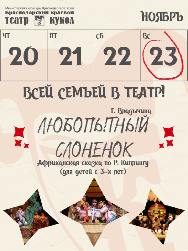 Смотрите спектакль «Любопытный слоненок», наполненный зажигательными ритмами, экзотическими танцами театра масок, интересными не только детям, но и взрослым. Одна из изюминок спектакля – настоящее барабанное шоу.